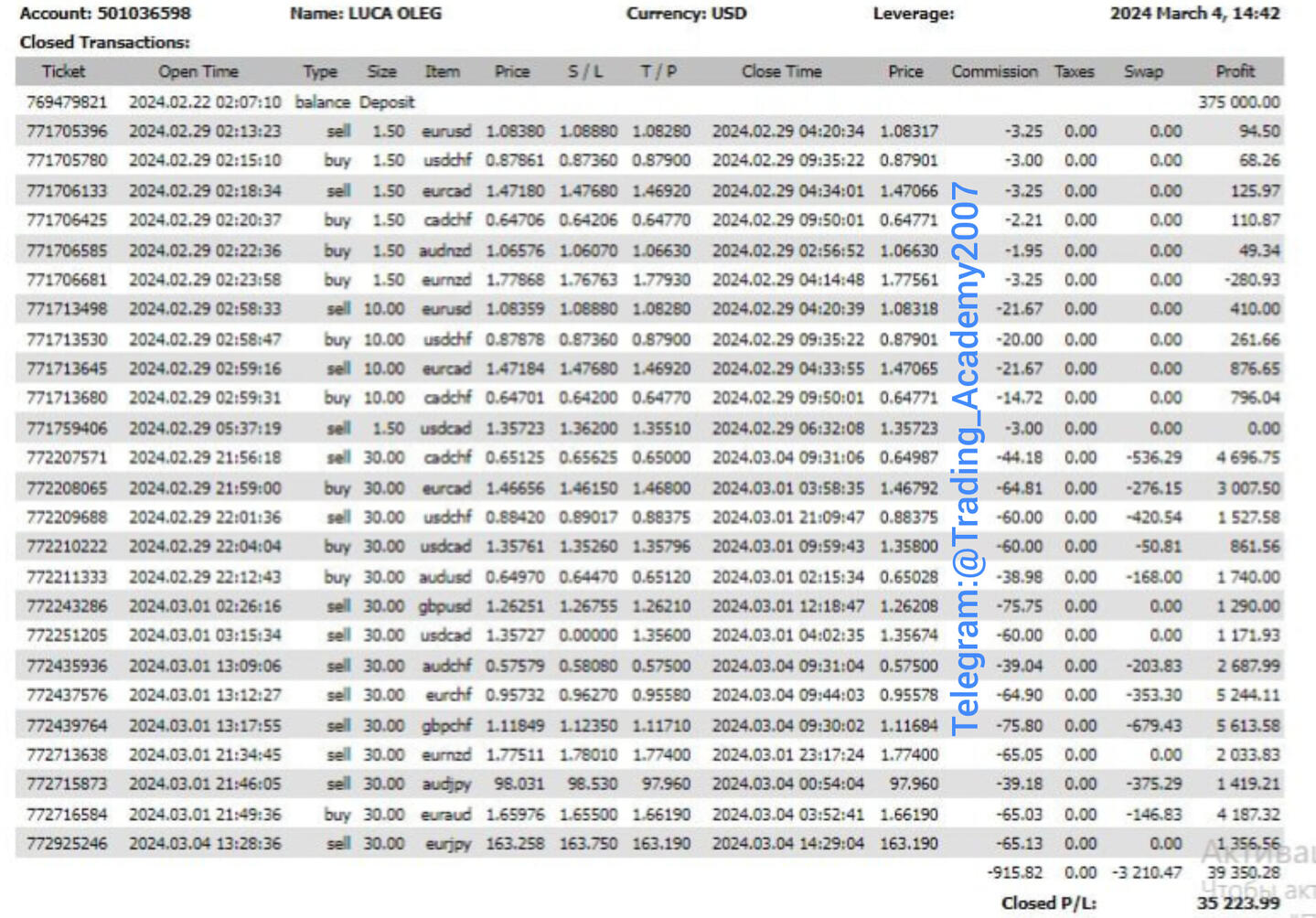 3. Если суммы депозитов первых двух счетов были примером того, что с доступными средствами почти каждый может, при умении, зарабатывать хорошие деньги, то данный пример демонстрирует, что деньги — это эквивалент вашего времени. Крупный депозит + эксклюзивные знания о трейдинге + 2–3 дня вашей работы могут обеспечить вас достойной жизнью в любой стране мира, скажем, на полгода. Депозит 375 000$. За два дня торговли — доход 35 224$.