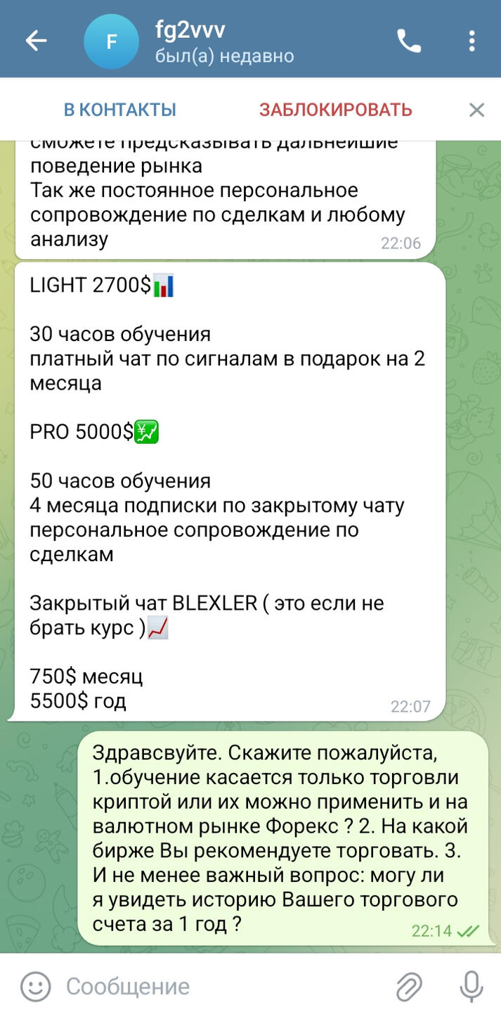 5. Вопрос:Можно ли сначала пройти обучение, заработать на трейдинге и потом оплатить его?Ответ:Хм...Вы серьёзно ? Девушки 20ти лет платят от 1000 евро за обучение перманентному татуажу. И это не считая расходов на тату-машинку, которая стоит не одну тысячу евро, расходных материалов, аренды помещения, рекламы и ещё Бог знает чего, чтобы начать зарабатывать первые деньги.Есть немало курсов по трейдингу, где за 300$ вам пообещают звезду с неба и впустят в комьюнити таких же, как вы. Вероятно Вам туда)6. Вопрос:Вы обучаете торговле на криптовалютной бирже и бинарных опционах?Ответ:Я обучаю торговле на валютной бирже Форекс. Инструменты, которые я даю в своих курсах, можно применить и при торговле криптовалютой, если у вас уже есть опыт работы с этим рынком. Кроме того, моя торговая стратегия применима к бинарным опционам, но за эти направления я не беру на себя даже моральной ответственности.И вот почему: сделки на бинарных опционах строго ограничены по времени. В то время как на рынке Форекс вы можете дождаться, пока ваша сделка выйдет в плюс, и закрыть её, в бинарных опционах такого выбора нет. Несмотря на потенциально высокую прибыль, они на практике несут значительно больше рисков.Торговля на криптовалютной бирже: